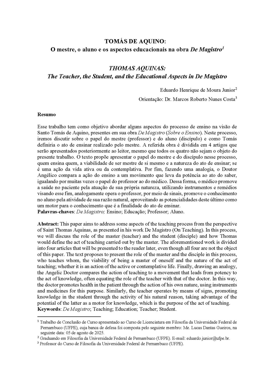 Título: Tomás de Aquino: o mestre, o aluno e os aspectos educacionais na obra De Magistro.